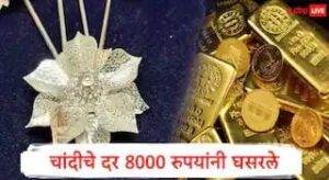 सोन्याप्रमाणं चांदीच्या दरात देखील मोठी घसरण झाली आहे. कमोडिटी एक्सचेंज ते देशांतर्गत बाजारात चांदीच्या दरात घसरण झाली आहे. मल्टी कमोडिटी एक्सचेंजवर एक किलोच्या चांदीच्या वायद्याचे दर १४ नोव्हेंबरला १५६०१८ रुपयांवर होते. ते, शुक्रवारी २१ नोव्हेंबरला १५४०५२ रुपयांवर आले. या हिशोबानं चांदीचे दर १९६६ रुपयांनी घसरले आहेत.