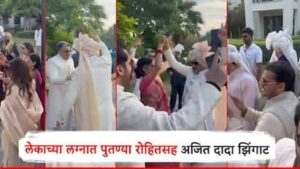 लेकाच्या लग्नाच सैराट चित्रटातील झिंगाट गाण्यावर नाचताना बापमाणूस आणि राज्याचे उपमुख्यमंत्री पाहून अनेकांना तो व्हिडिओ चांगलाच आवडलाय. जय यांच्या वरातीत अजित पवारांसह आमदार रोहित पवार आणि युगेंद्र पवार हेही दिसून येत आहेत. रोहित पवार यांनीही पांढऱ्या रंगाचा शेरवानी आणि डोळ्यावर गॉगल घातल्याचं दिसून येतं. दरम्यान, या लग्नसोहळ्यातील हळदीचेही फोटो समोर आले असून पवार आणि पाटील कुटुंबीयांसह नातलगांच्या चेहऱ्यावरील लग्नाचा आनंदोत्सव लपत नाही.
