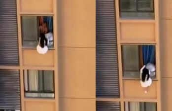 या व्हिडिओ क्लिपमध्ये एक शर्टलेस पुरुष खिडकीबाहेर लटकणाऱ्या महिलेशी बोलत असल्याचे दिसते. काही काळातच तो दिसेनासा होतो. त्यानंतर ती महिला खाली सरकते. पाईप आणि खिडक्यांच्या काचा ओलांडत ती मदतीसाठी खिडकी वाजवते. आत असलेला माणूस खिडकी उघडतो आणि तिला आत घेतो, असा घटनाक्रम व्हिडिओत दिसतो.