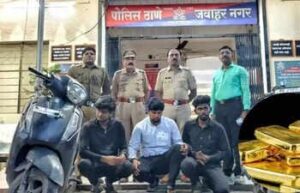 छत्रपती संभाजीनगर : तुम्ही १ कोटी रुपयांच्या सोन्याची स्मगलिंग केली असून तुमच्याविरोधात सायबर पोलिस ठाण्यात गुन्हा दाखल आहे, अशी भीती दाखवली आणि पोलिस असल्याची थाप मारून अल्पवयीन मुलाकडून एकूण अडीच लाख रूपये किंमतीचे सोन्याच्या दागिने खंडणी स्वरूपात घेतल्याचा प्रकार समोर आली . या प्रकरणात छत्रपती संभाजीनगरमधील जवाहरनगर पोलिसांनी वेदांत राजकुमार राठोड (वय २२, रा. तिसगाव ता. खुलताबाद, ह.मु. दत्त मंदिर, बंजारा कॉलनी), गौरव ज्ञानेश्वर धनवडे (वय २१, रा. आरडा तोलाजी ता. मंठा जि. जालना, ह.मु. साई सारा कॉलनी, बजाजनगर) आणि अमित मनोहर महतो (राजपुत) (वय २३) या तिघांना ताब्यात घेतले आहे. तर रोहन सुनिल उगले, तेजस्वी विजय पवार हे फरार असल्याची माहिती पोलिसांनी दिली.