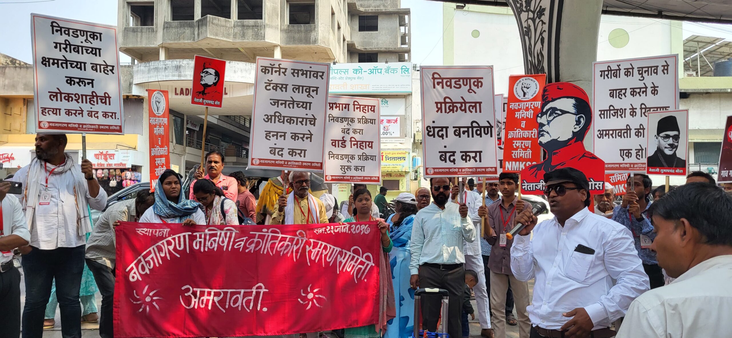 यावेळी समितीद्वारा आयोजित रॅलीमध्ये इन्कलाब जिंदाबाद, नेताजी सुभाष चंद्र बोस अमर रहे, नेताजी के विचारो को गाव शहर में फैला दो, गरीबो को चुनाव से बाहर करने के साजिश को विफल करो, गरीबो को चुनाव से बाहर करने के साजिश के खिलाफ अमरावती की जनता एक हो, बॅनर पोस्टर वर टॅक्स लावून लुटने बंद करा, चुनाव आयोग होश मे आओ, नेताजी का नारा है ये संघर्ष हमारा है, निवडणूक प्रक्रियेला धंदा बनविणे बंद करा, प्रभाग निहाय निवडणूक प्रक्रिया बंद करा, वार्ड निहाय निवडणूक प्रक्रिया सुरू करा, निवडणुका गरिबांच्या क्षमतेच्या बाहेर करून लोकशाहीची हत्या करणे बंद करा, कॉर्नर सभांवर टॅक्स लावून जनतेच्या अधिकारांचे हनन बंद करा, महिलाओ पर अत्याचार करणा बंद करो, टीव्ही, पत्र, पत्रिका, सिनेमा, इंटरनेट के माध्यम से नग्नता और अश्लीलता परोसना बंद करो, शिक्षा का निजीकरण करना बंद करो, इत्यादी घोषणा देण्यात आल्या.