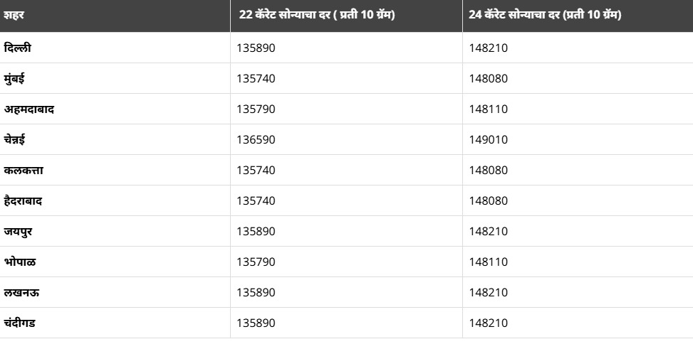 या दोन शहरांमध्ये, २४ कॅरेट सोन्याचा भाव प्रति १० ग्रॅम १,४८,०८० रुपये आणि २२ कॅरेट सोन्याचा भाव प्रति १० ग्रॅम १,३५, ७४० रुपये आहे.