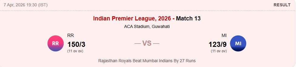 आयपीएल २०२६ : मुंबई इंडियन्स राजस्थान रॉयल्सला त्यांच्या घरच्या मैदानात एकूण तिसरा सामना जिंकण्यापासून रोखण्यात अपयशी ठरली आहे. यजमान संघाने पलटणवर २७ धावांनी मात करत सलग तिसरा सामना जिंकला आहे.