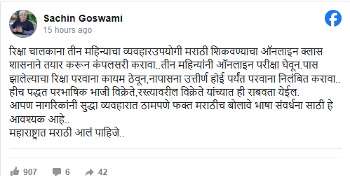 सचिन गोस्वामी यांनी फेसबूकवर एक पोस्ट शेअर करत स्वतःचं मत मांडलं आहे… रिक्षा चालकांना तीन महिन्यांचा व्यवहारउपयोगी मराठी शिकवण्याचा ऑनलाइन क्लास शासनाने तयार करून कंपलसरी करावा..तीन महिन्यांनी ऑनलाइन परीक्षा घेवून पास झालेल्याचा रिक्षा परवाना कायम ठेवून, नापास झालेल्यांचा उत्तीर्ण होईपर्यंत परवाना निलंबित करावा.. हीच पद्धत परभाषिक भाजी विक्रेते, रस्त्यावरील विक्रेते यांच्यात ही राबवता येईल. आपण नागरिकांनी सुद्धा व्यवहारात ठामपणे फक्त मराठीच बोलावे भाषा संवर्धना साठी हे आवश्यक आहे.. महाराष्ट्रात मराठी आलं पाहिजे….. असं देखील सचिन गोस्वामी म्हणाले आहेत. यावर अनेकांनी कमेंट करत प्रतिक्रिया दिल्या आहे.
